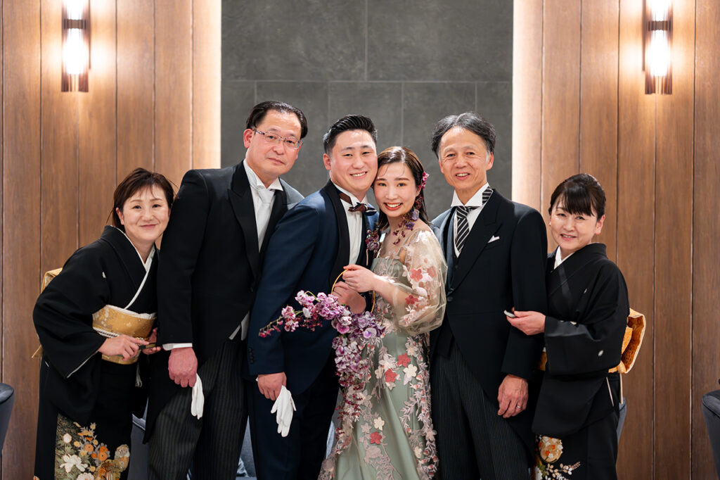 とても家族仲の良いご両家とおふたり。 パーティーの間もご家族の笑顔が溢れ、 中座のタイミングや披露宴の後にもご家族だけのお写真を沢山撮影しています。